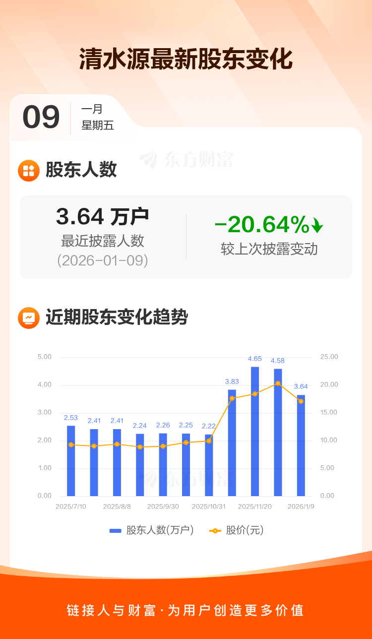 清水源:截至1月9日最新股东户数3.64万户,较上期减少20.64%