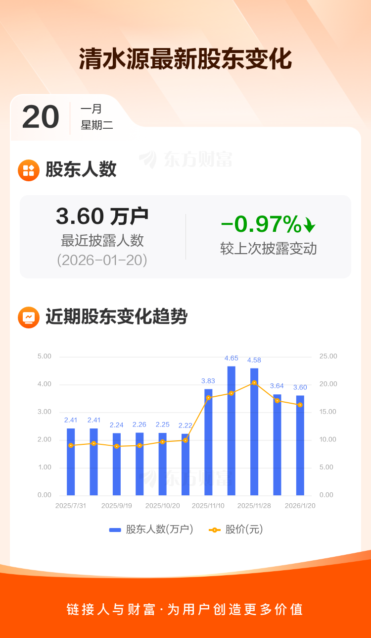 清水源:截至1月20日最新股东户数3.60万户,较上期减少0.97%