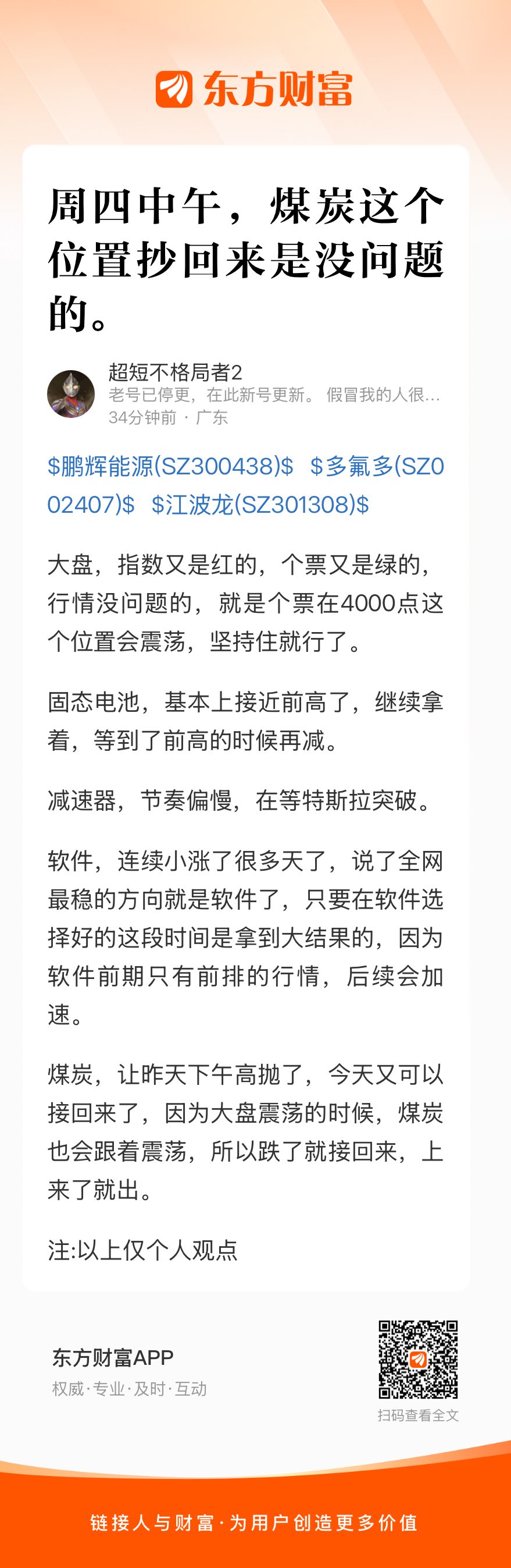 郑重声明:用户在财富号/股吧/博客等社区发表的所有信息(包括但不限于文字、视频、音频、数据及图表)仅代表个人观点,与本网站立场无关,不对您构成任何投资建议,据此操作风险自担。请勿相信代客理财、免费荐股和炒股培训等宣传内容,远离非法证券活动。请勿添加发言用户的手机号码、公众号、微博、微信及QQ等信息,谨防上当受骗!