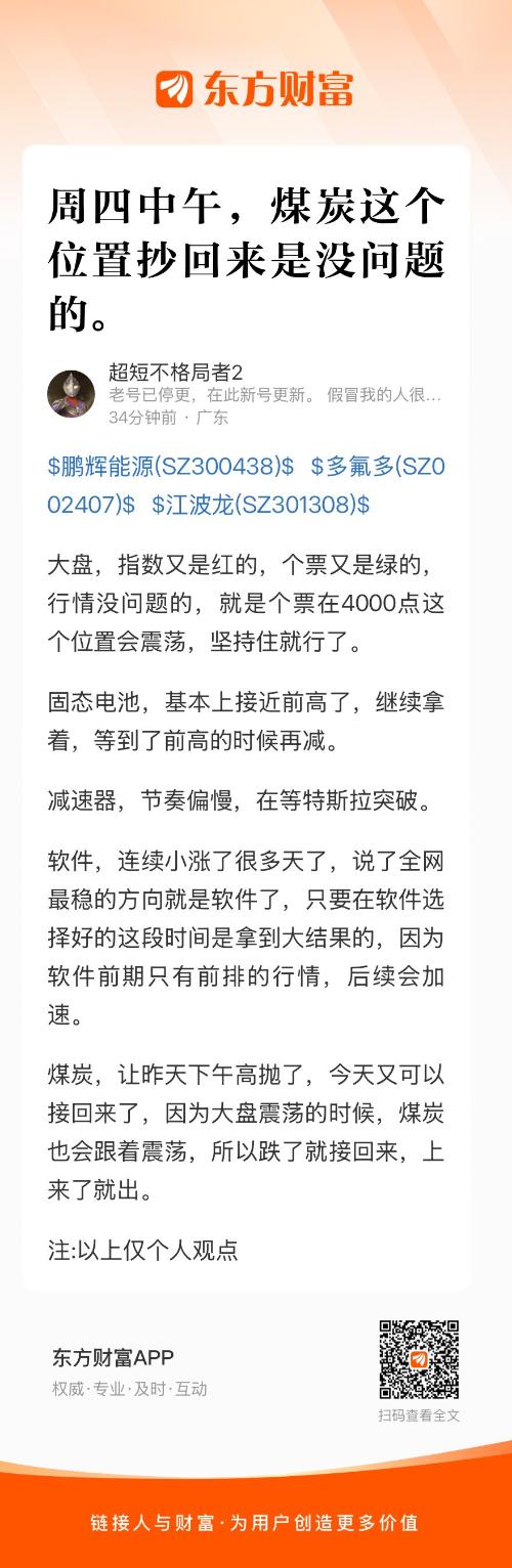 煤炭,让昨天下午高抛了,今天又可以接回来了,因为大盘震荡的时候,煤炭也会跟着震荡,所以跌了就接回来,上来了就出。