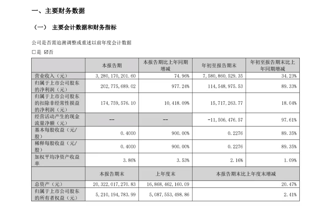 公告显示,前三季度,鹏辉能源实现营业收入75.81亿元,同比增长34.23%;实现净利润1.15亿元,同比增长89.33%。其中,第三季度实现营业收入32.8亿元,同比增长74.96%;实现净利润2.03亿元,同比增长977.24%。