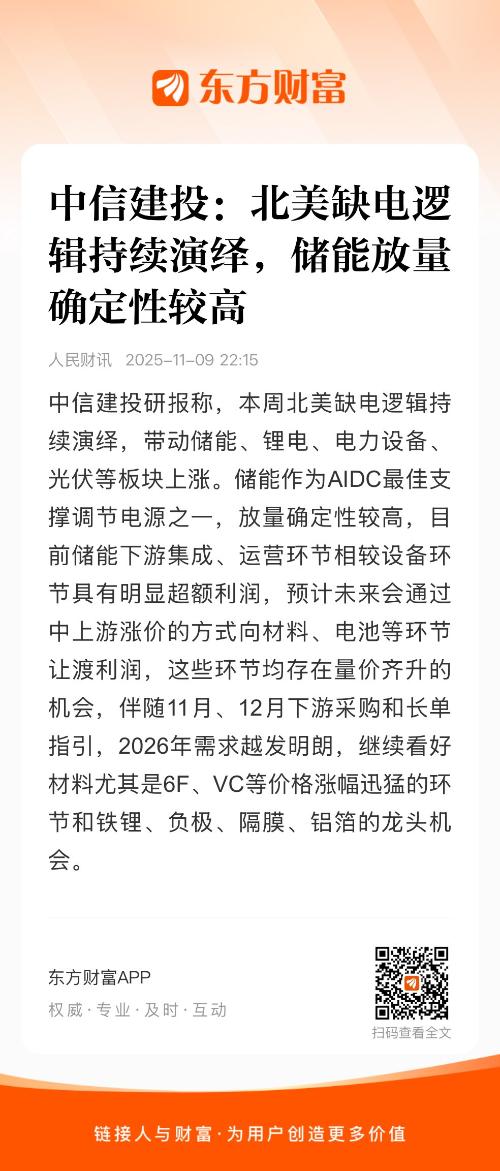 中信建投研报称,本周北美缺电逻辑持续演绎,带动储能、锂电、电力设备、光伏等板块上涨。储能作为AIDC最佳支撑调节电源之一,放量确定性较高,目前储能下游集成、运营环节相较设备环节具有明显超额利润,预计未来会通过中上游涨价的方式向材料、电池等环节让渡利润,这些环节均存在量价齐升的机会,伴随11月、12月下游采购和长单指引,2026年需求越发明朗,继续看好材料尤其是6F、VC等价格涨幅迅猛的环节和铁锂、负极、隔膜、铝箔的龙头机会。
