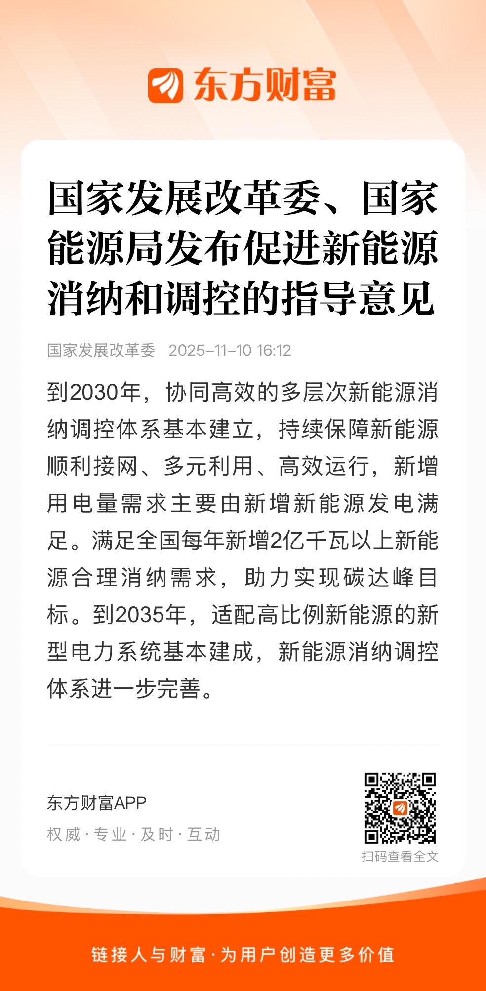 国家发展改革委、国家能源局发布关于促进新能源消纳和调控的指导意见。其中提出,到2030年,协同高效的多层次新能源消纳调控体系基本建立,持续保障新能源顺利接网、多元利用、高效运行,新增用电量需求主要由新增新能源发电满足。满足全国每年新增2亿千瓦以上新能源合理消纳需求,助力实现碳达峰目标。到2035年,适配高比例新能源的新型电力系统基本建成,新能源消纳调控体系进一步完善。