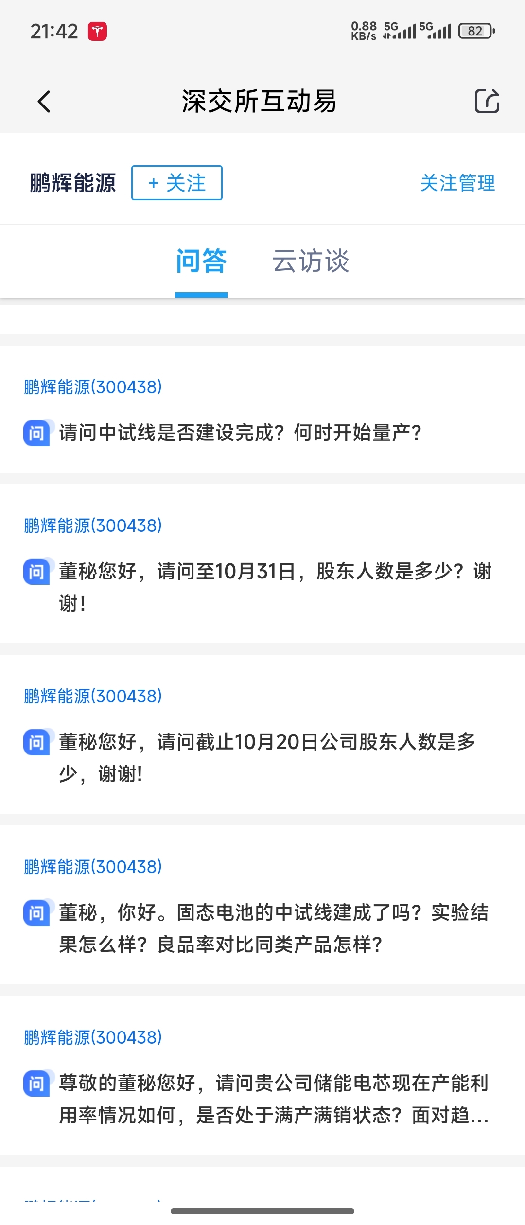 $鹏辉能源(SZ300438)$ 9月17日起公司在深交所互动平台超过两个月停止回复任何问题。其中中试产线问题被提问2次。如此长时间不回答问题已涉嫌公司信息披露违规,不知道是什么意思,我不敢假设。希望吧友们一起动起来,向深圳证监局投诉热线:0755-83263315(工作日 8:30–11:45,13:30–17:00)0755-82083000(深交所投资者教育中心)