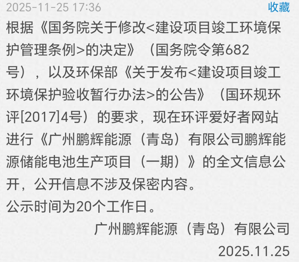 鹏辉能源储能电池生产项目(一期)竣工,已环境保护验收。鹏辉能源储能电池生产项目(