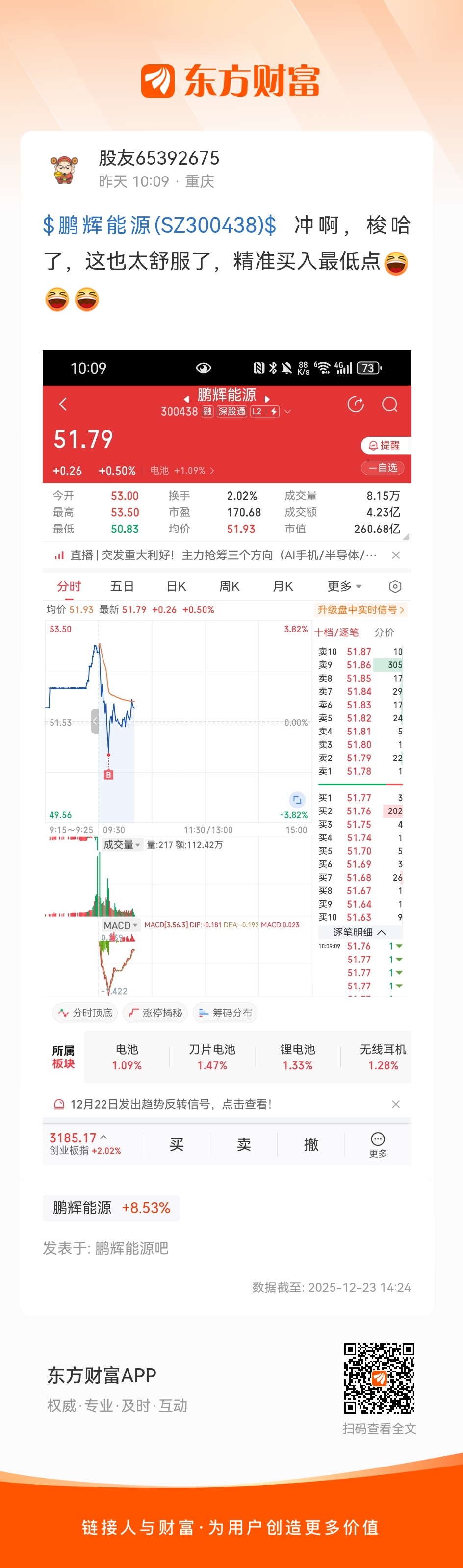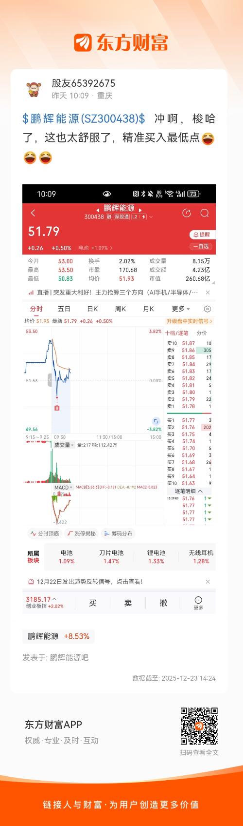 $鹏辉能源(SZ300438)$  冲啊,梭哈了,这也太舒服了,精准买入最低点