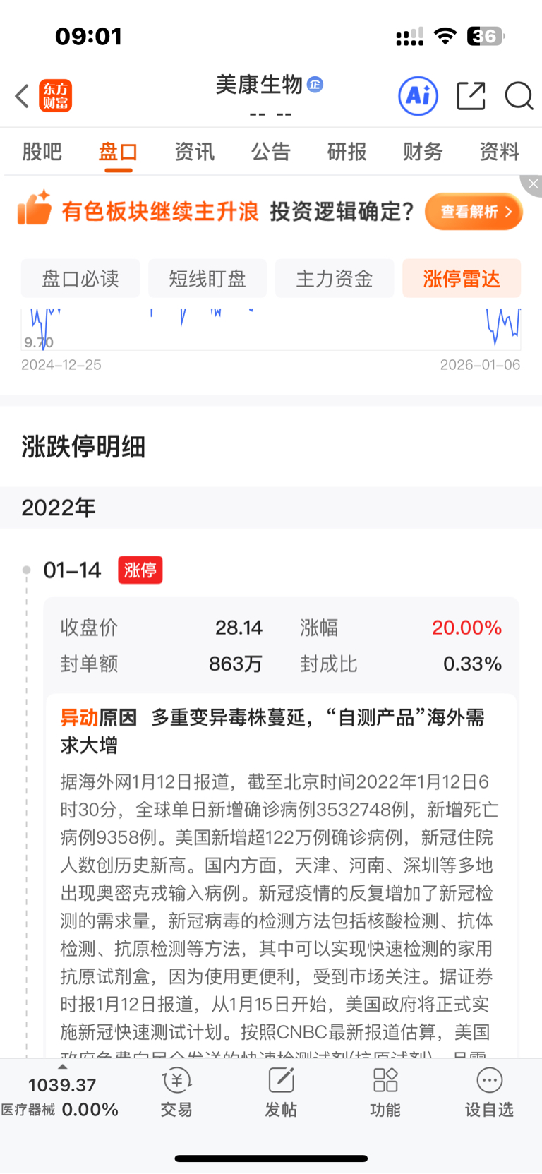 $美康生物(SZ300439)$ 离上一次涨停已经过去4年了