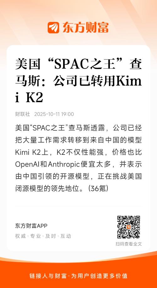 美国“SPAC之王”查马斯透露,公司已经把大量工作需求转移到来自中国的模型Kimi K2上,K2不仅性能强,价格也比OpenAI和Anthropic便宜太多,并表示由中国引领的开源模型,正在挑战美国闭源模型的领先地位。 (36氪)