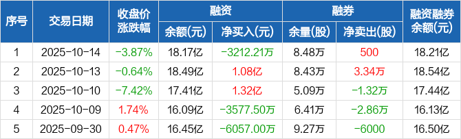 融资方面,当日融资买入1.52亿元,融资偿还1.84亿元,融资净偿还3212.21万元。融券方面,融券卖出7200股,融券偿还6700股,融券余量8.48万股,融券余额407.04万元。融资融券余额合计18.21亿元。