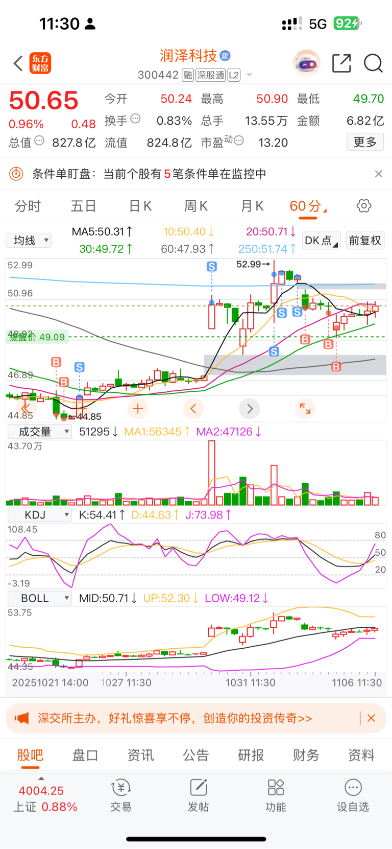 $润泽科技(SZ300442)$ 润泽很安全位置又不高,有业绩估值低,机会大于风险,留住底仓高抛低吸……不会做T的不动也没事上60没问题。我太闲手贱喜欢乱动,从60分钟图看5150上方有个缺口压力,不能直接突破那我会做个T,我其实擅长隔日T可惜数据不在计算中,不然数据会亮瞎小伙伴的双眼