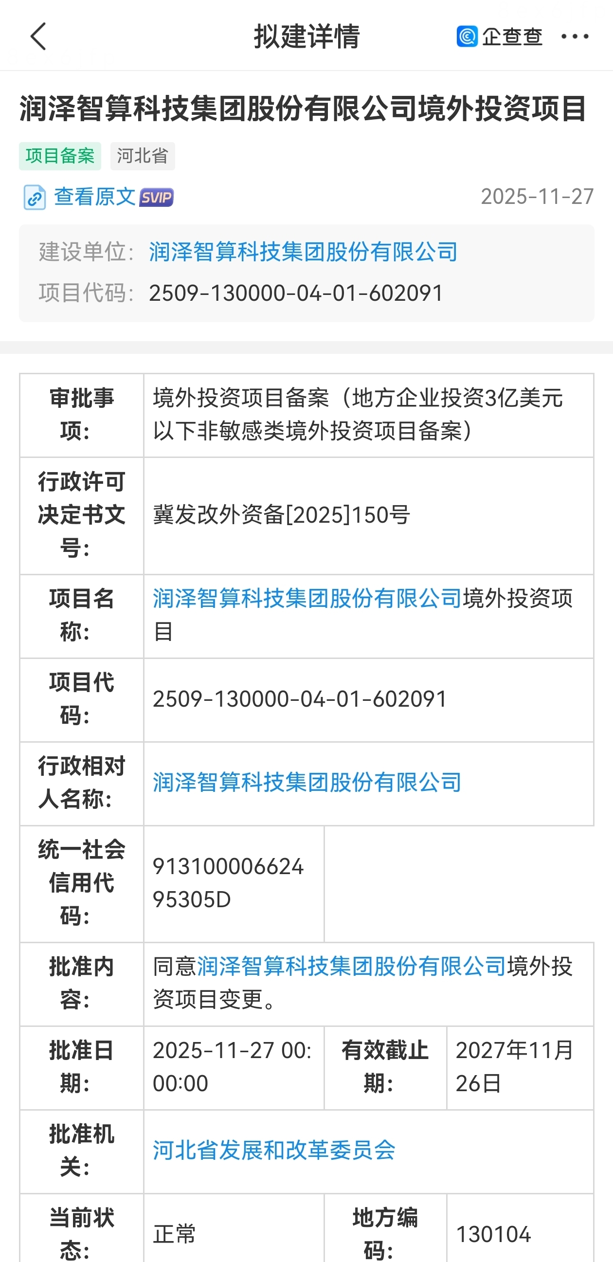 河北省发展和改革委员会同意润泽智算科技集团股份有限公司在中国香港开展润泽(沙岭)