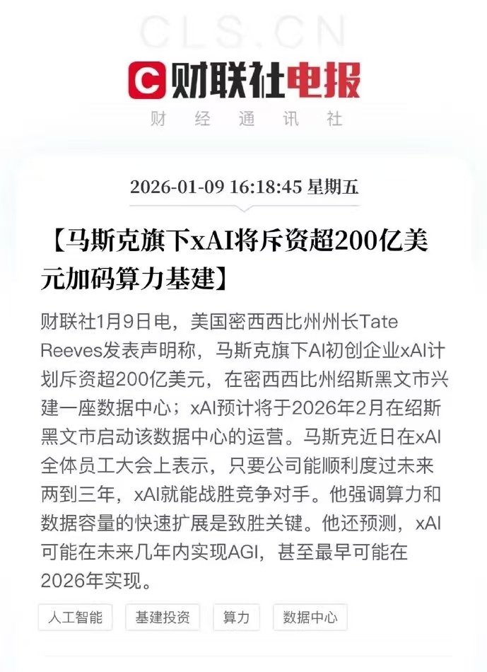盘后大消息,马斯克又带头建数据中心了,200亿美元,2月份就要启动运营,东大跟不