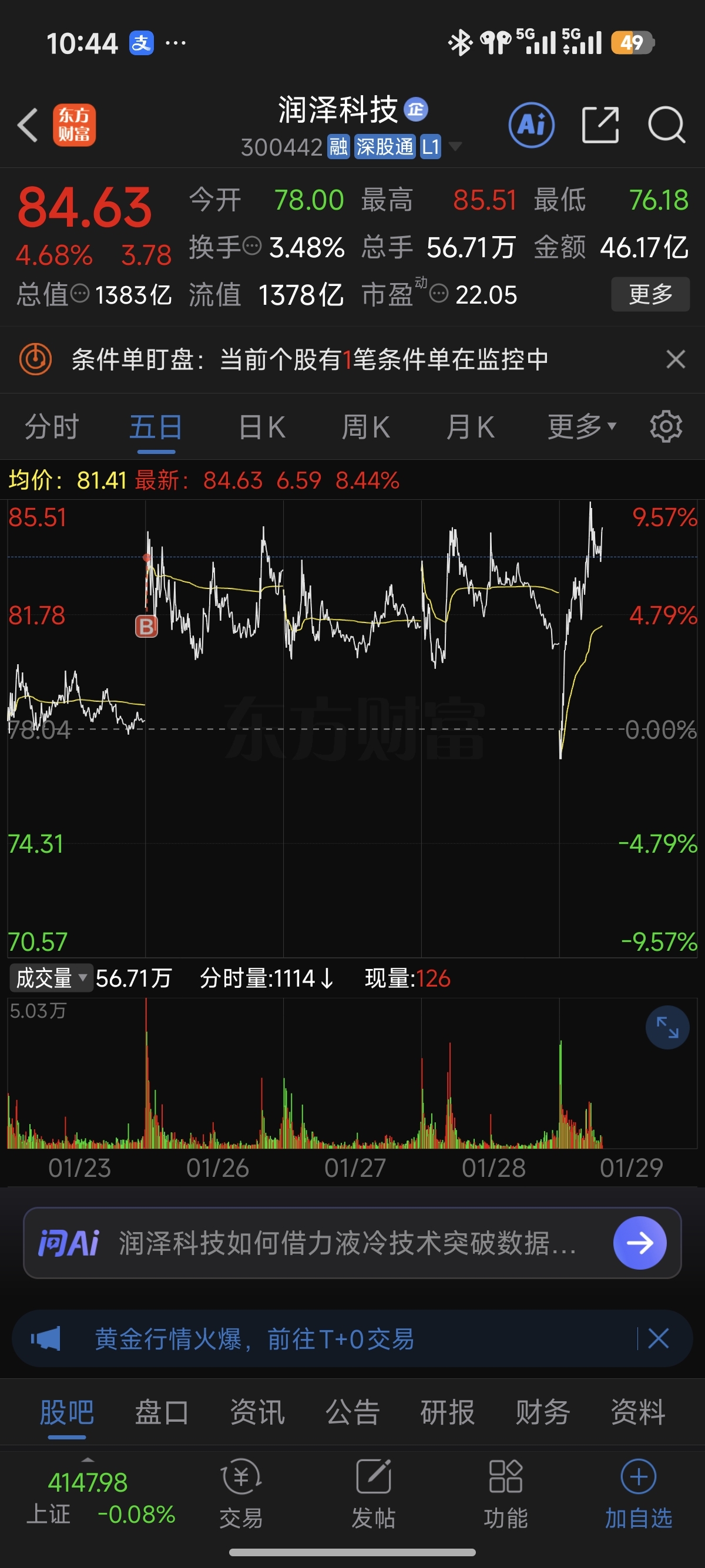 $润泽科技(SZ300442)$ 买了4天了没看,今天一看还是在84附近蹦跶。