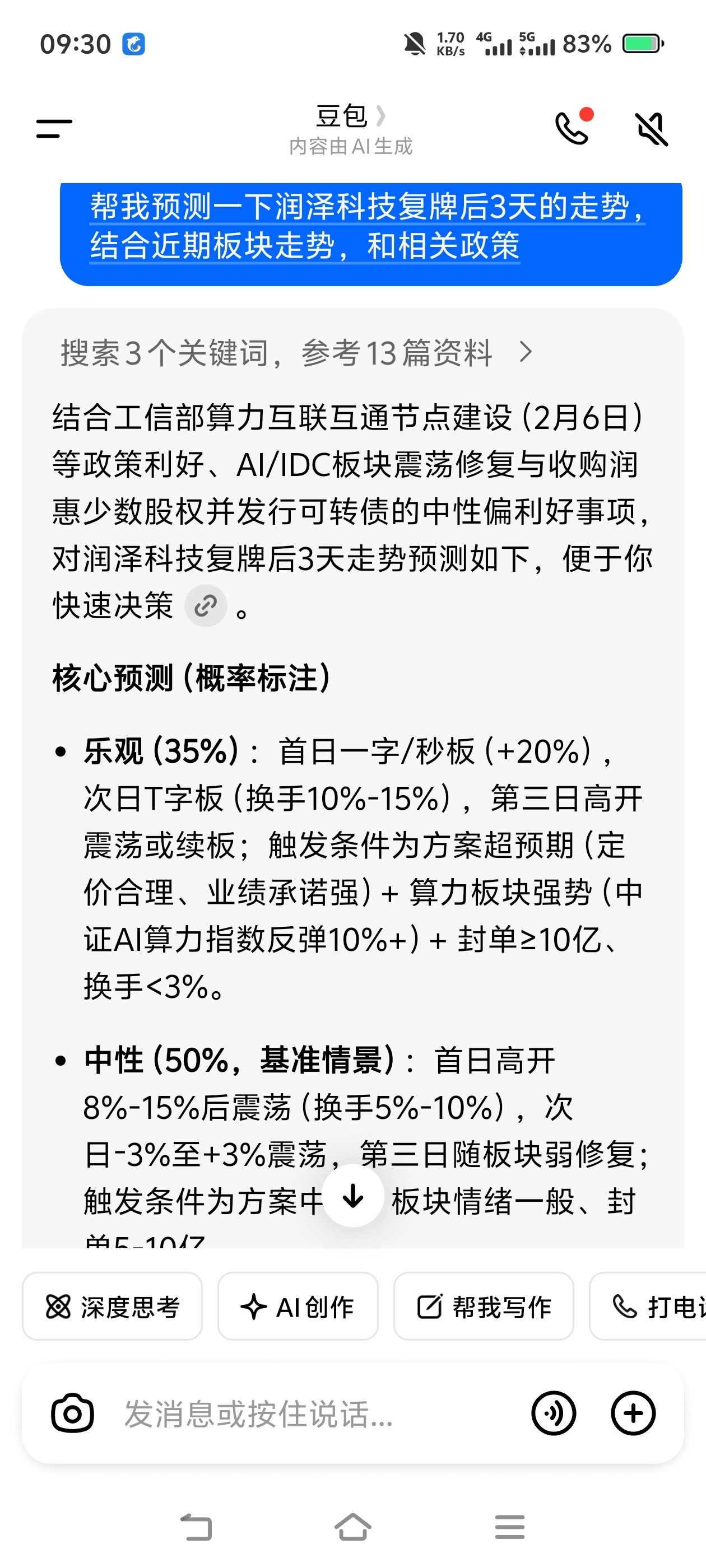 $润泽科技(SZ300442)$ 豆包给的概率有百分之50一字板,看第一天封单有没有100亿,有的话,第二天还是一字,相反,第二天冲高走人,主要还需要结合下周算力板块走势