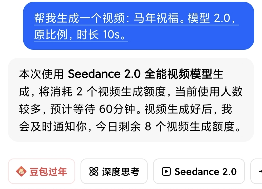 豆包开始抢红包了,sd2.0同步上线使用,就是生成短片要排队,算力还是不够,春晚