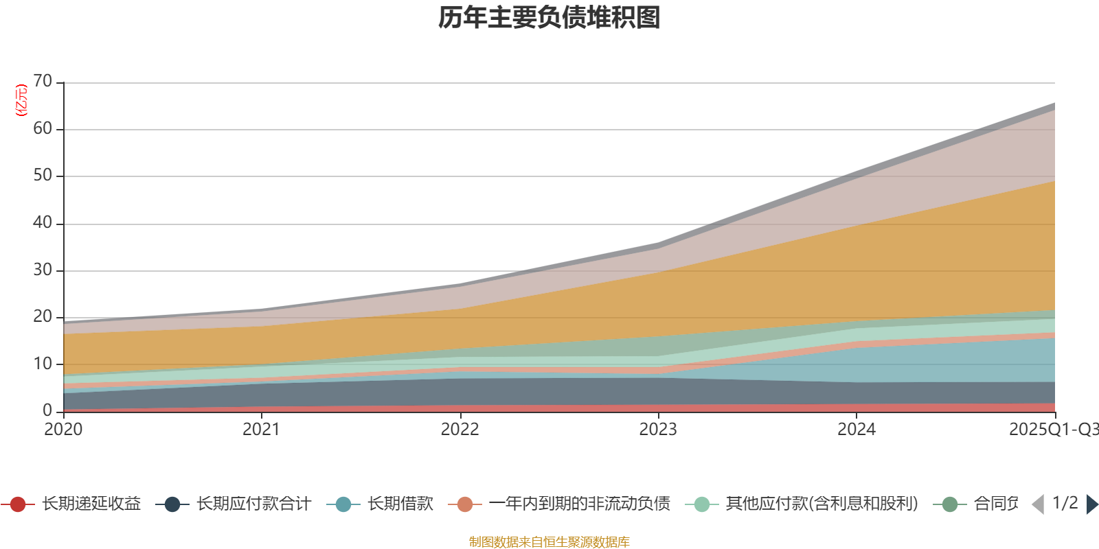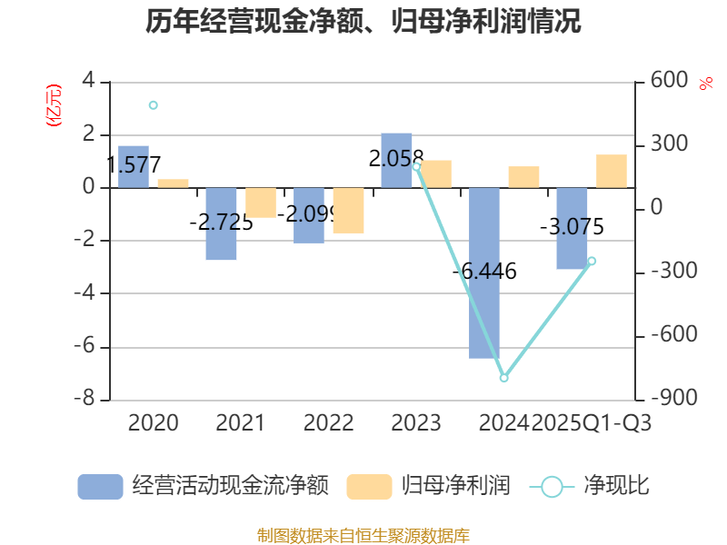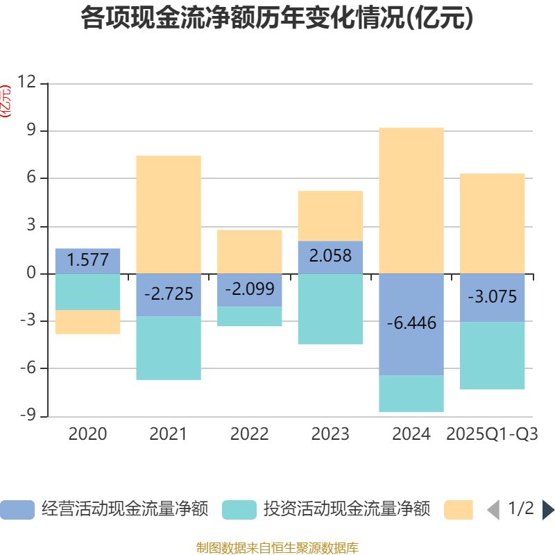 2025年前三季度,公司经营活动现金流净额为-3.08亿元,同比减少1089.06万元;筹资活动现金流净额6.3亿元,同比增加1.06亿元;投资活动现金流净额-4.23亿元,上年同期为-3.37亿元。