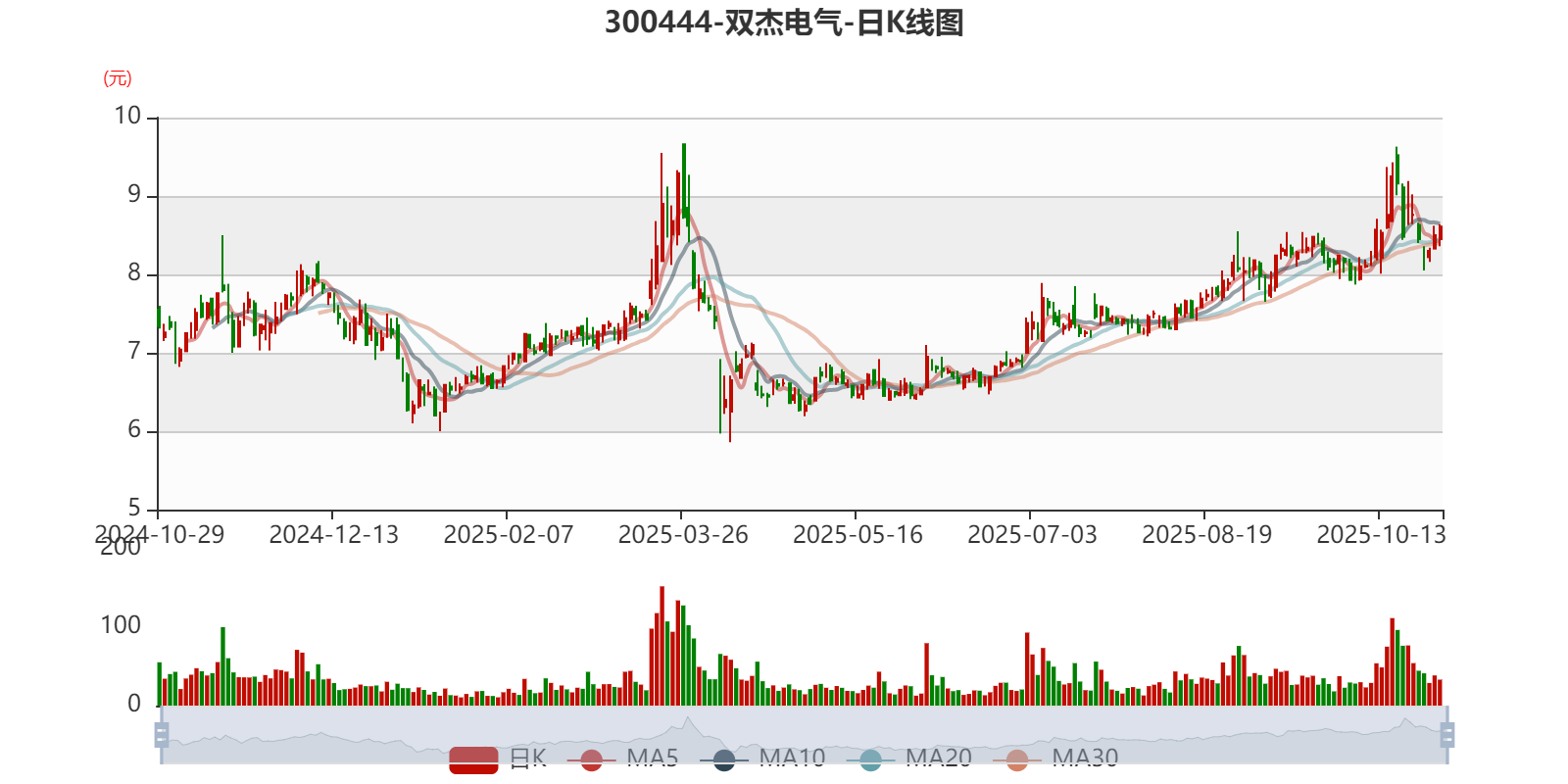 中证智能财讯双杰电气(300444)10月29日披露2025年第三季度报告。前三季度公司实现营业总收入33.09亿元,同比增长29.08%;归母净利润1.25亿元,同比增长7.59%;扣非净利润1.25亿元,同比增长1.92%;经营活动产生的现金流量净额为-3.08亿元,上年同期为-2.97亿元;报告期内,双杰电气基本每股收益为0.1566元,加权平均净资产收益率为7.35%。