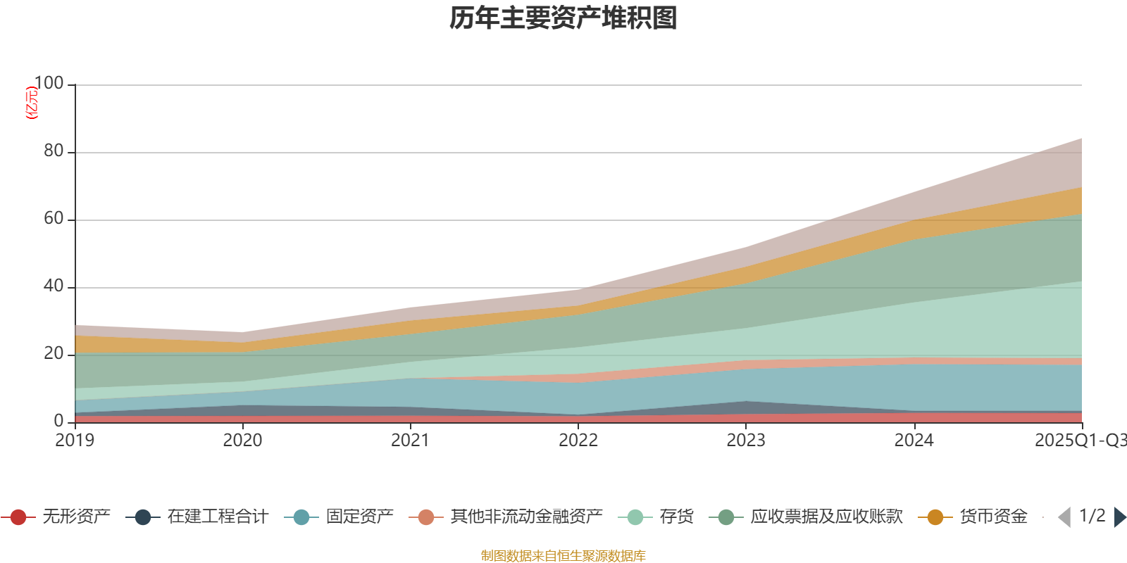 资产重大变化方面,截至2025年三季度末,公司固定资产较上年末减少1.82%,占公司总资产比重下降4.15个百分点;其他非流动资产较上年末增加7767.21%,占公司总资产比重上升3.68个百分点;应收票据及应收账款较上年末增加7.62%,占公司总资产比重下降3.48个百分点;存货较上年末增加39.42%,占公司总资产比重上升3.12个百分点。