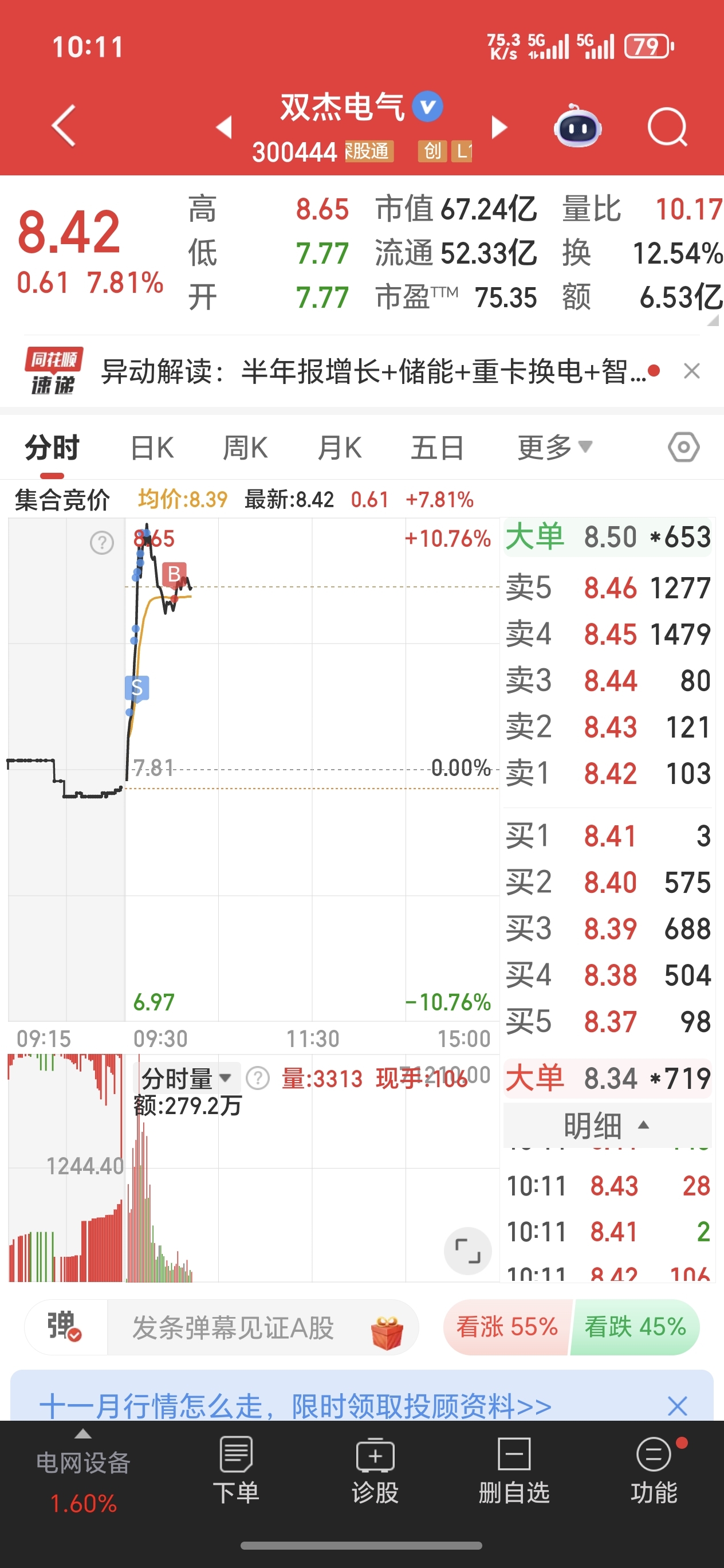 $双杰电气(SZ300444)$ 舒服呀,冲高出了一半,慢慢接回来