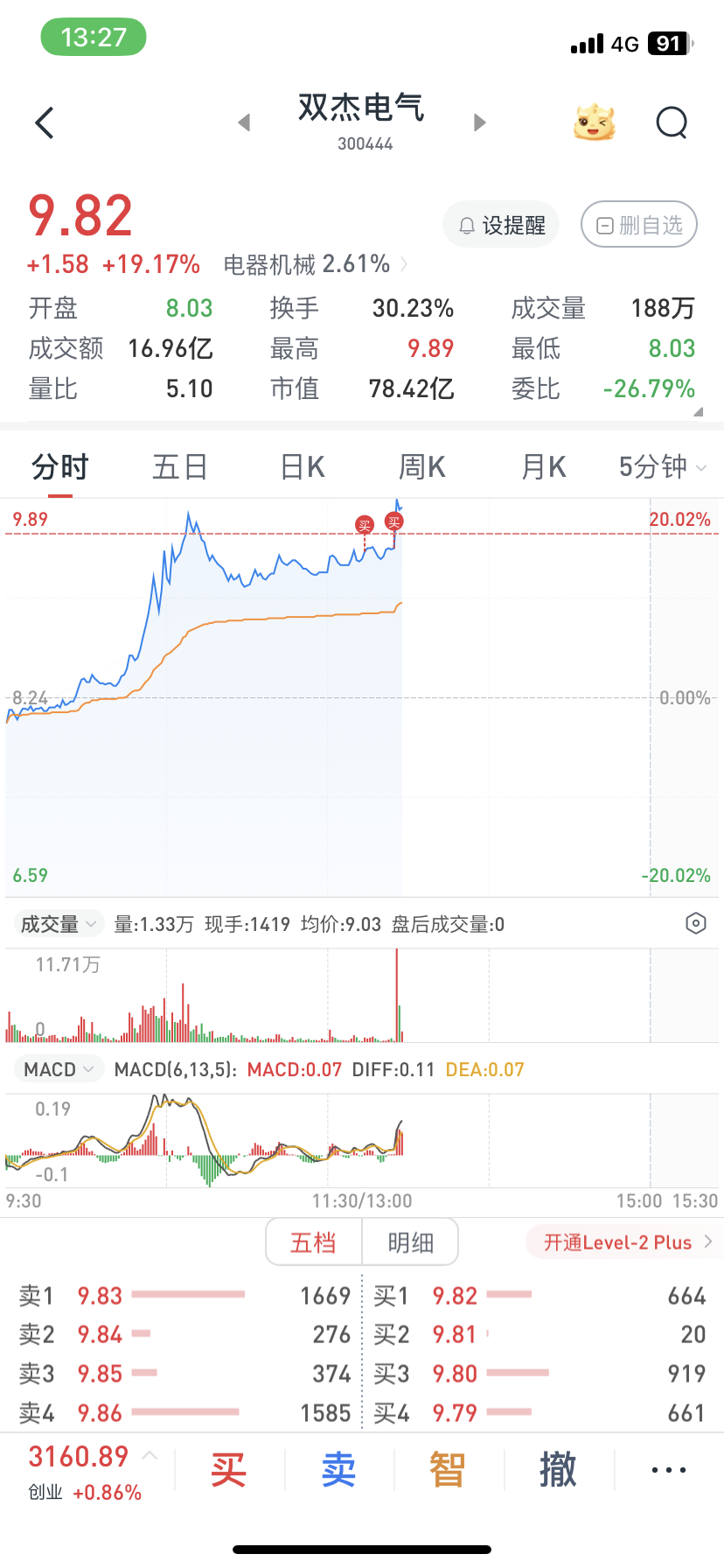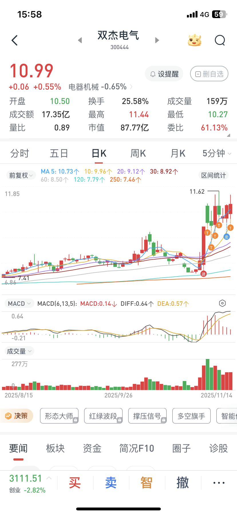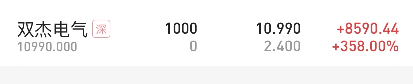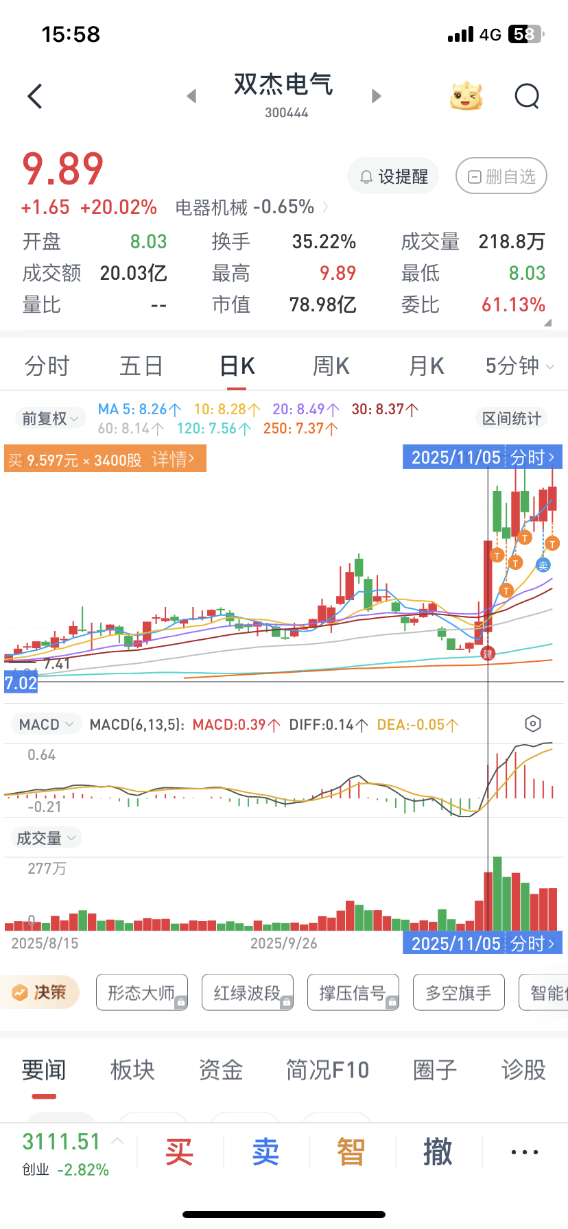 自11月5号追涨停建仓3400股(全仓了)以来正好10天了,留1000股观察,本来只想留100股,暂时先要去中国电影了,等过段时间再回来,还会继续留意双杰,感谢主力配合。