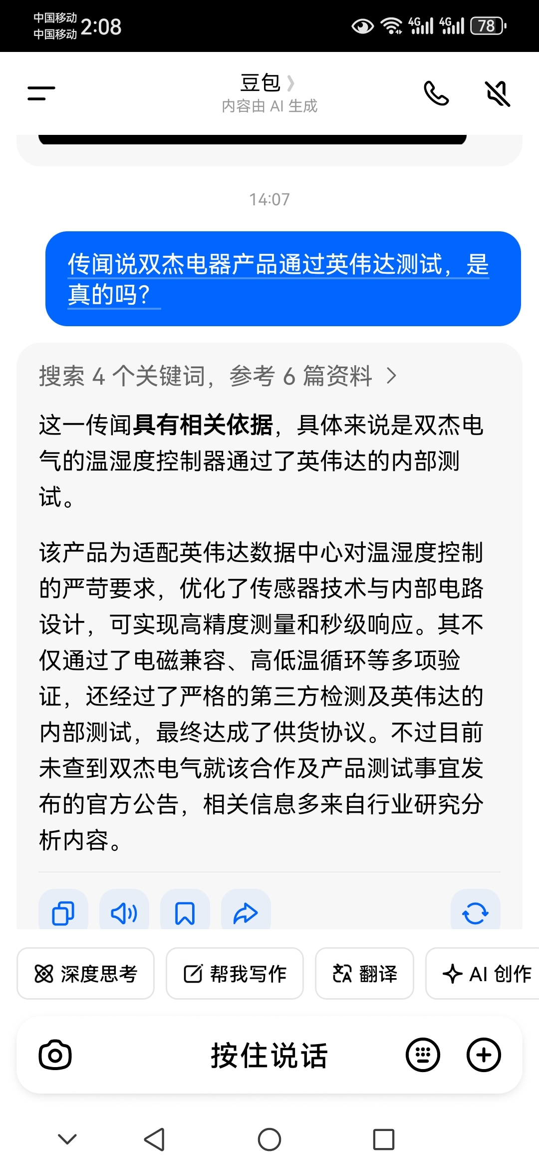 $双杰电气(SZ300444)$ 弹幕满天飞,我给大家查查豆包