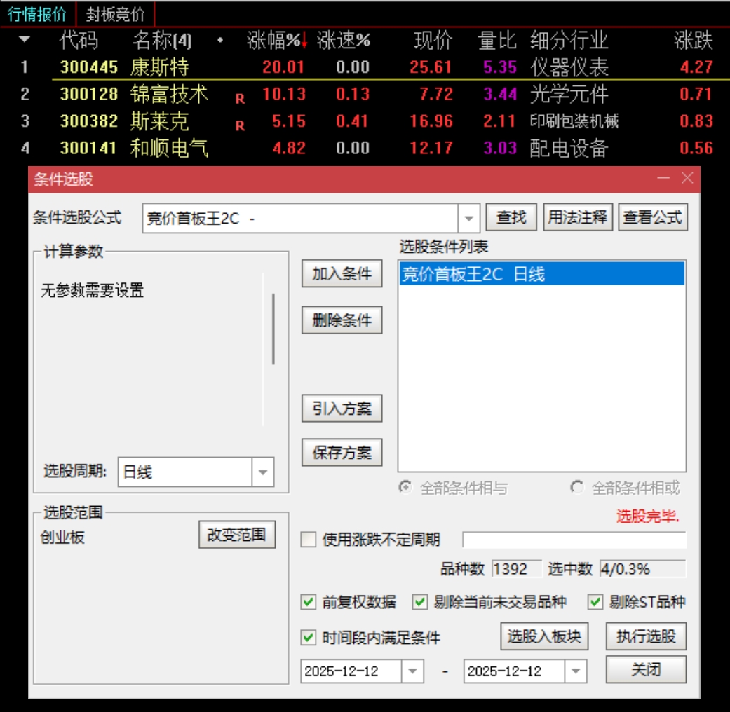 $康斯特(SZ300445)$ 龙抬头竞价首板王战法,做股票不要追高更不要打板,想实现稳定复利就要做低位竞价首板,龙抬头竞价首板王选股软件,开盘前竞价选股不做马后炮,买在低位3个点左右,博当天或者次日溢价甚至首板涨停!龙抬头竞价首板王专门抓20厘米首板涨停!