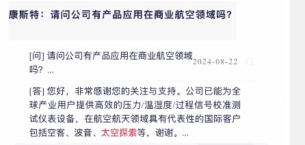 互动易回复公司已能为全球产业用户提供高效的压力/温湿度/过程信号校准测试仪表设备,在航空航天领域具有代表性的国际客户包括空客、波音、太空探索(space x)等