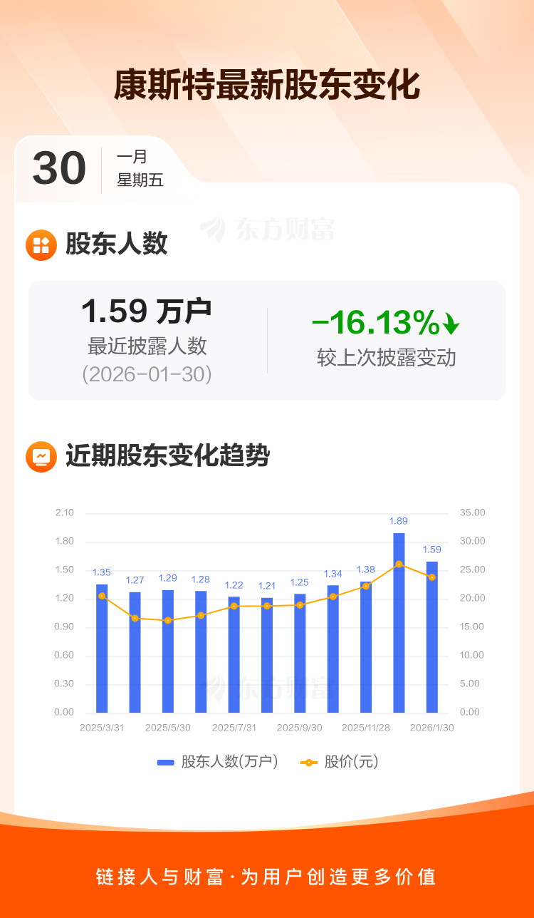 康斯特最新披露数据显示,截至1月30日公司股东户数为1.59万户,较上期(2025年12月31日)减少3055户,降幅为16.13%。户均持有流通股数量由上期的7501股上升至8944股,户均持股金额由上期的19.55万元增加至21.24万元。