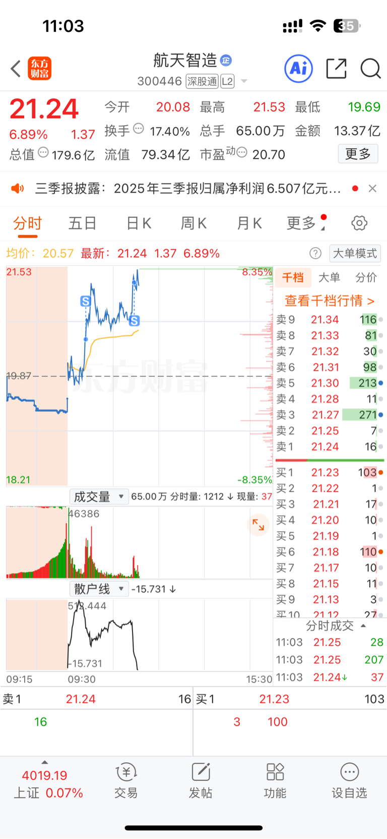 $航天智造(SZ300446)$ 4月熬到现在。全部清仓 等20块钱在回来,成交量太大5日线跟不上