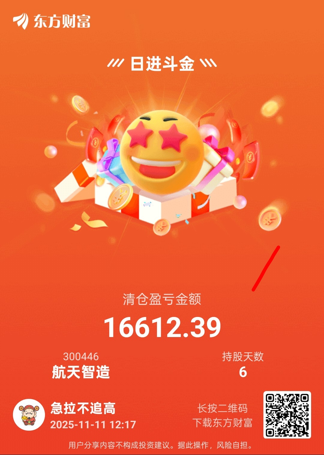 $航天智造(SZ300446)$ 最高赚十三个点,最后赚8.5个点,撤了,留下的发财