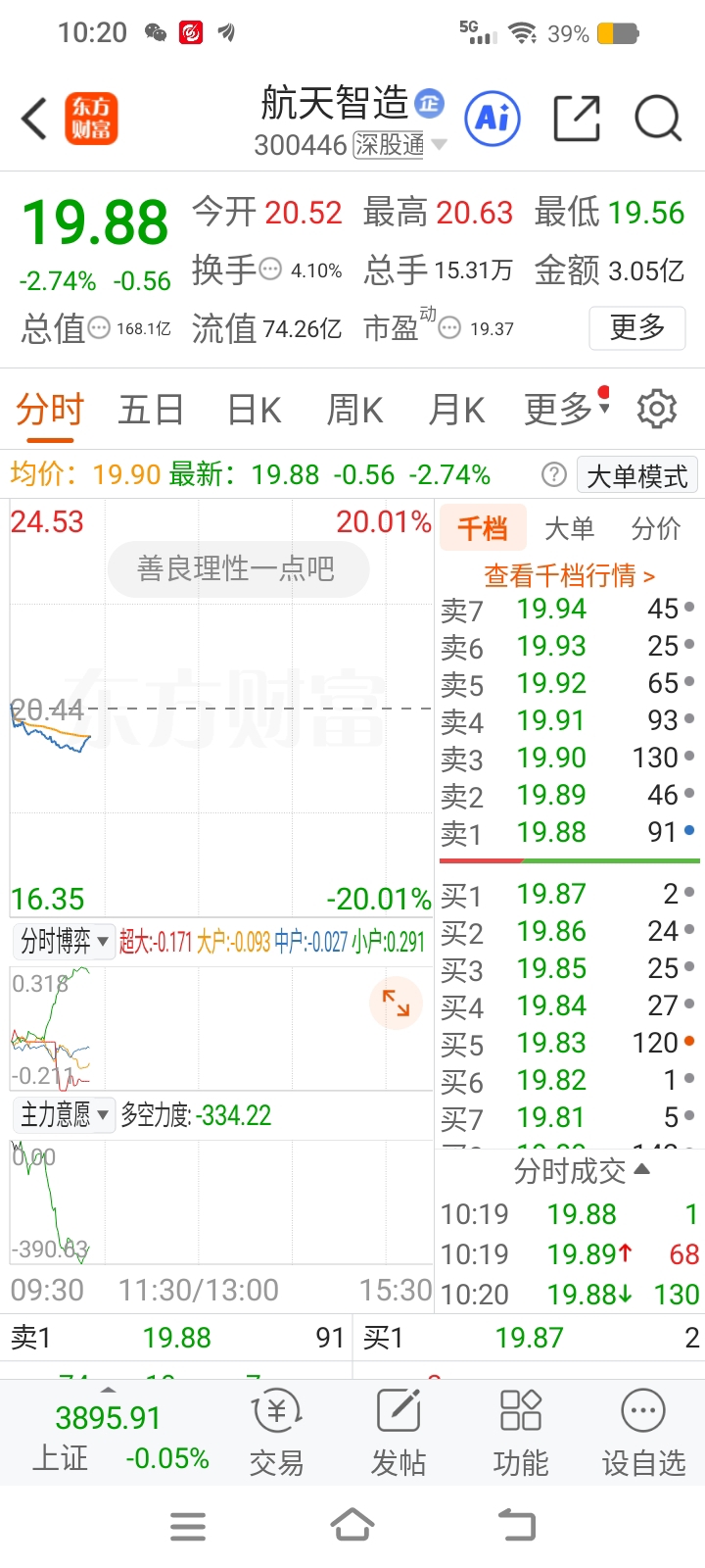 $航天智造(SZ300446)$ 错过了开盘,一路下跌三大控盘齐抛就小散小单接