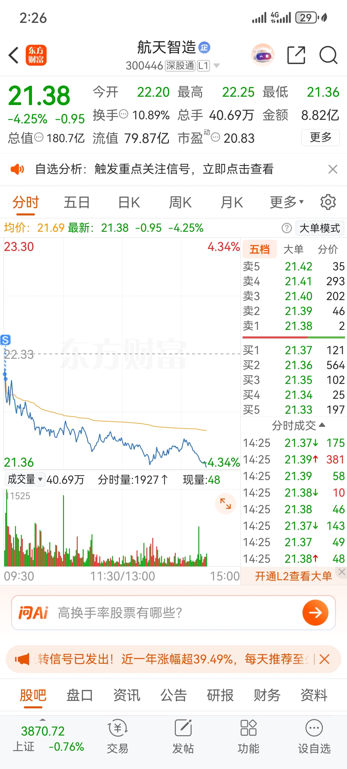 $航天智造(SZ300446)$ 看前天开盘价21.21能不能守住了