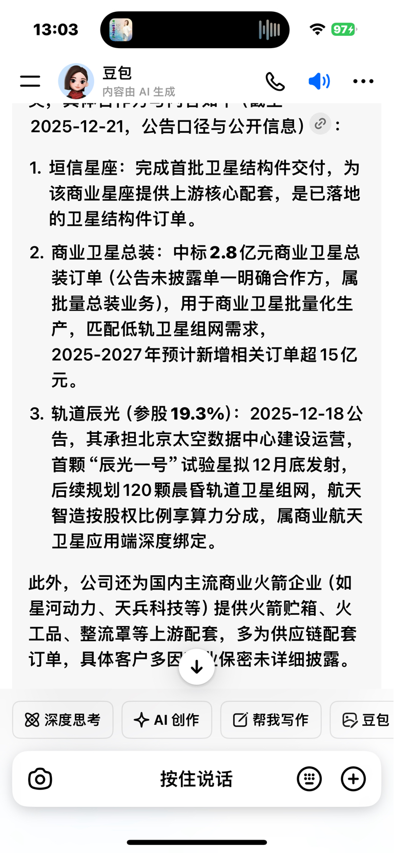 $航天智造(SZ300446)$ 间接给商业航天供货,而且已经有订单落地,但不参与火箭卫星发射,走的应该是无人驾驶概念,不过这股跟其它军工股比业绩强多了,中国卫星那叫啥业绩烂死了,六七百亿市值,卫通两三亿的业绩千亿市值,涨跌看主力吧,不是我们能左右的