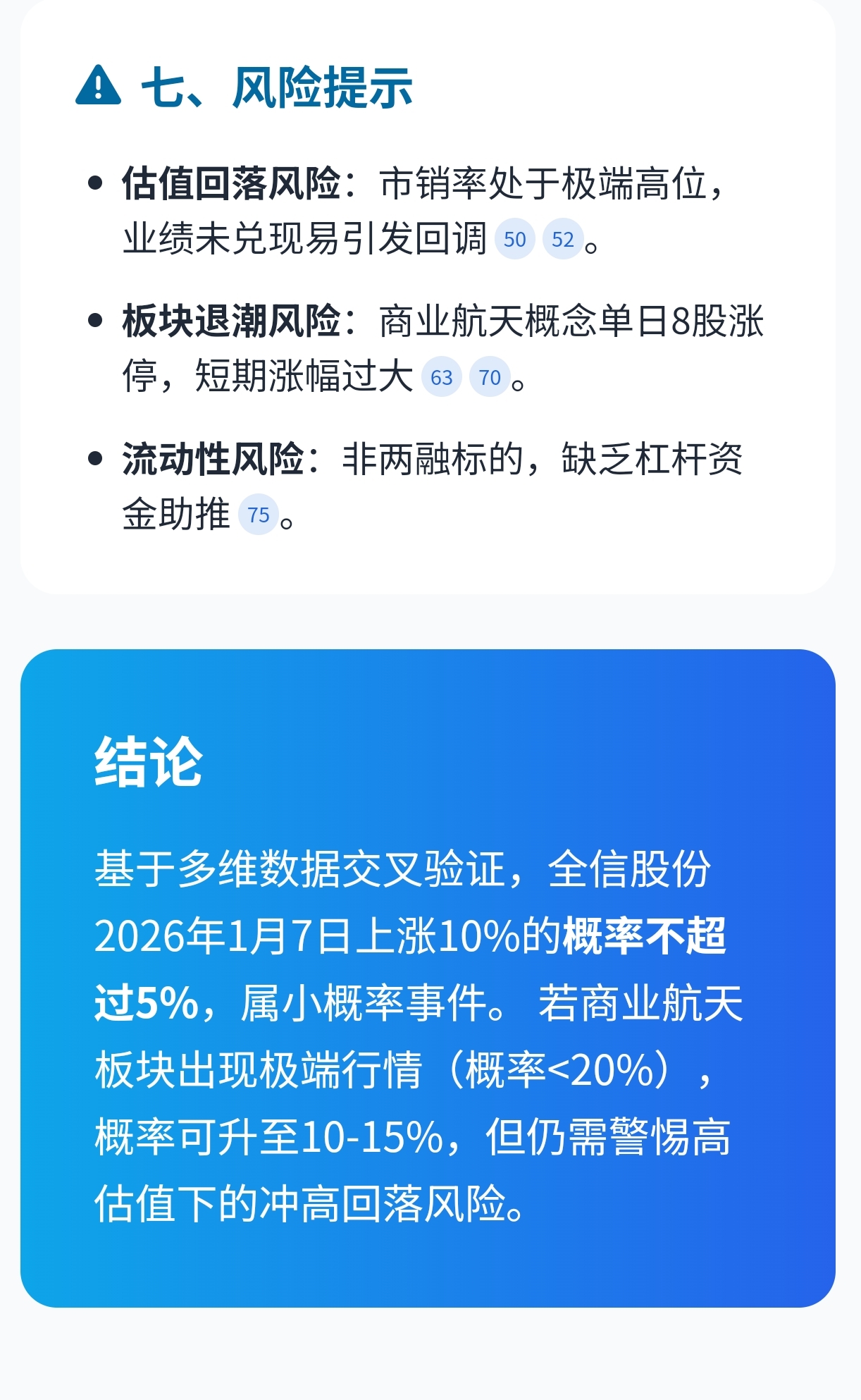 基于多维数据交叉验证,全信股份2026年1月7日上涨10%的概率不超过5%,属小概率事件。 若商业航天板块出现极端行情(概率<20%),概率可升至10-15%,但仍需警惕高估值下的冲高回落风险。