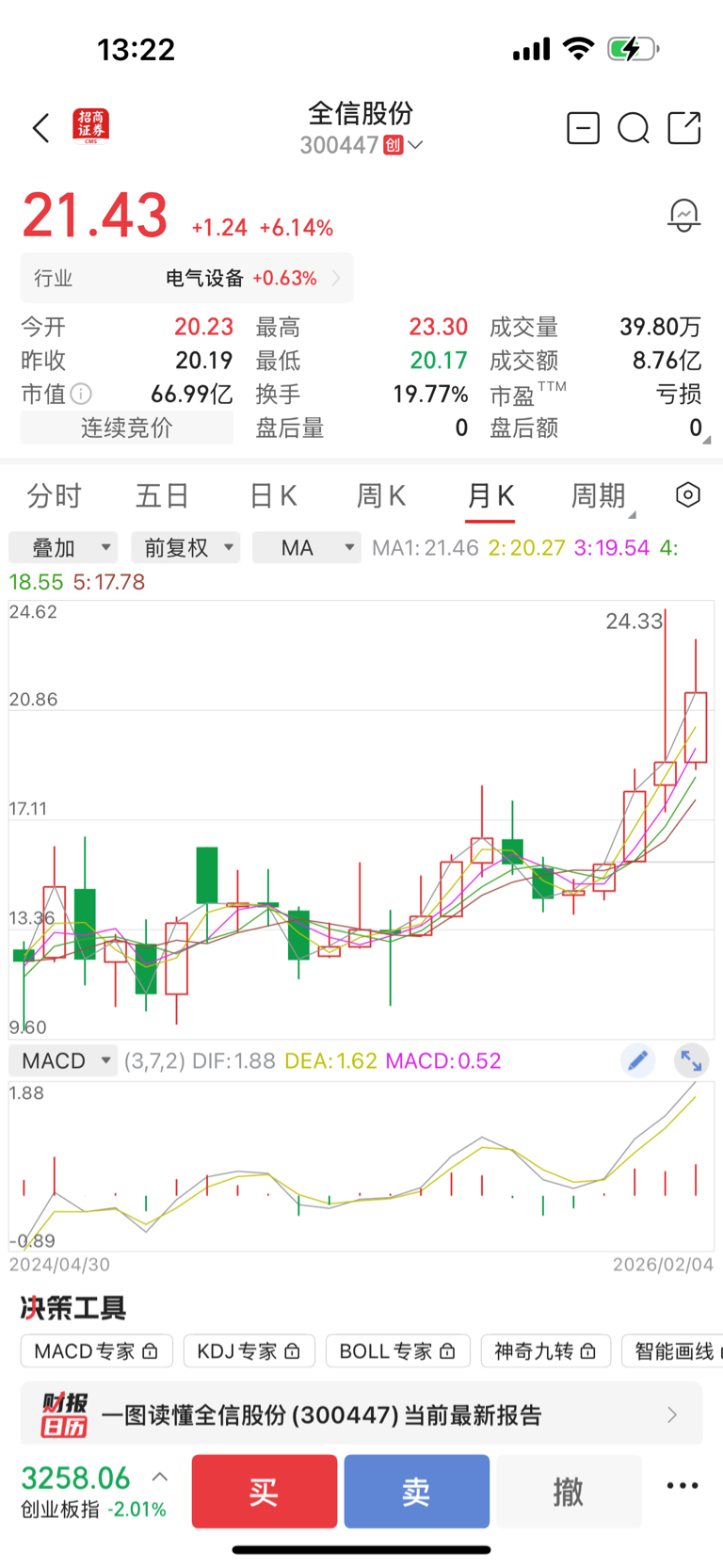 $全信股份(SZ300447)$ 月K均线金叉趋势向上,稳稳拿住不下车。