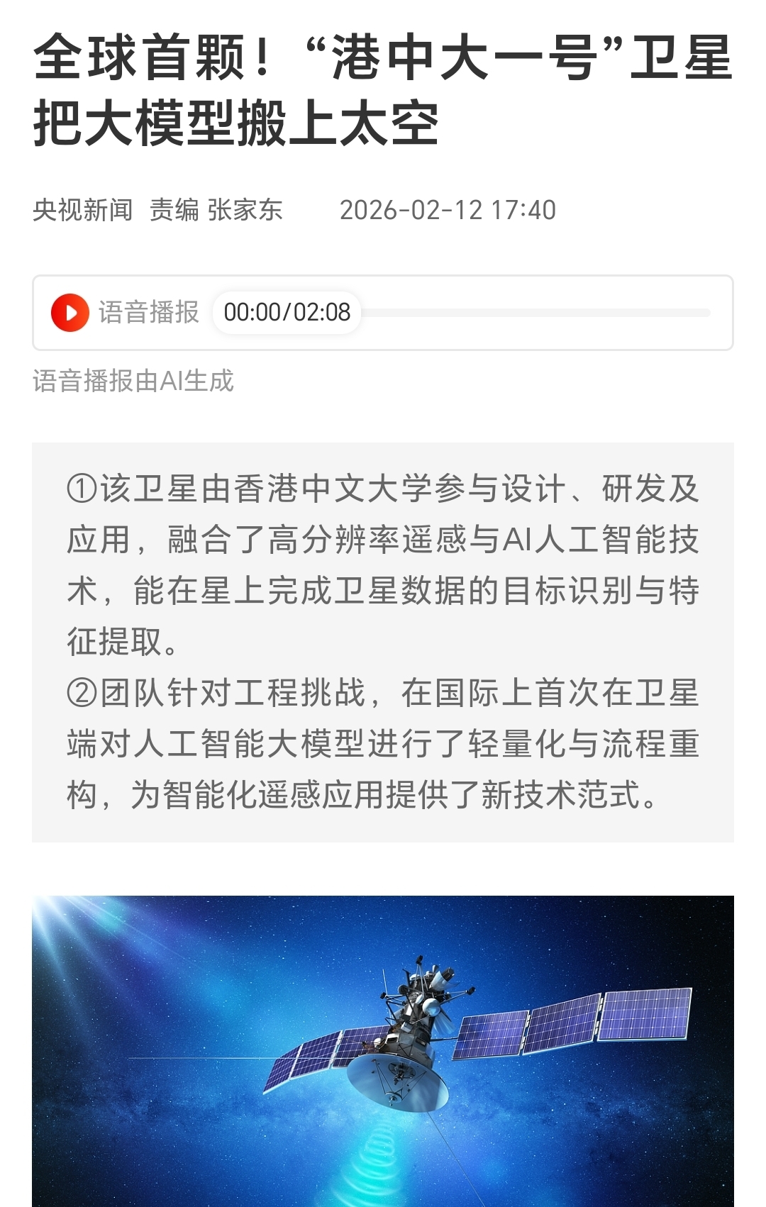 全球首颗!“港中大一号”卫星把大模型搬上太空相关材料产品供应合作公司:全信股份节