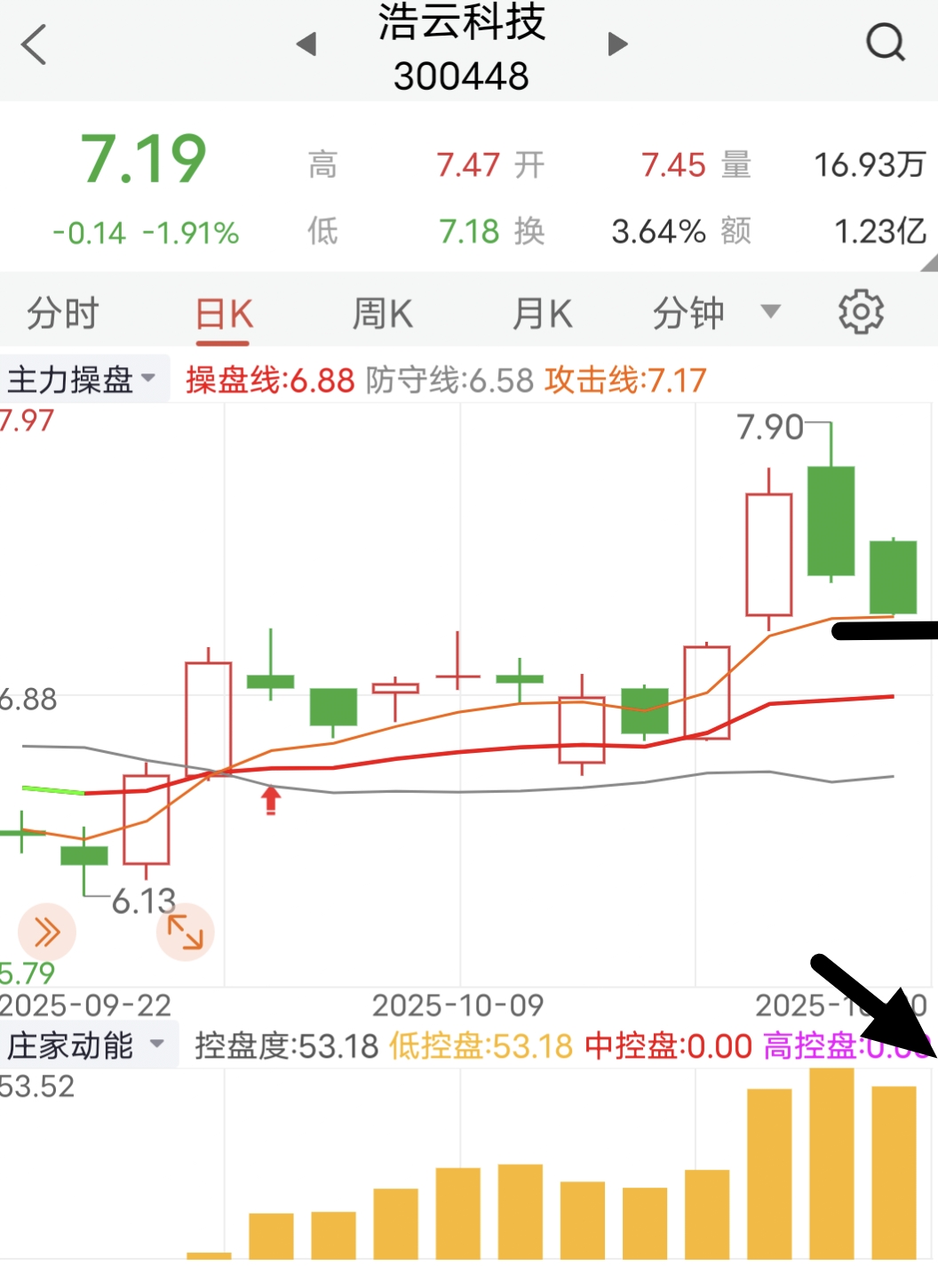 $浩云科技(SZ300448)$ 实时盘中动态:缩量回踩主力短期进攻线,主力资金目前减仓