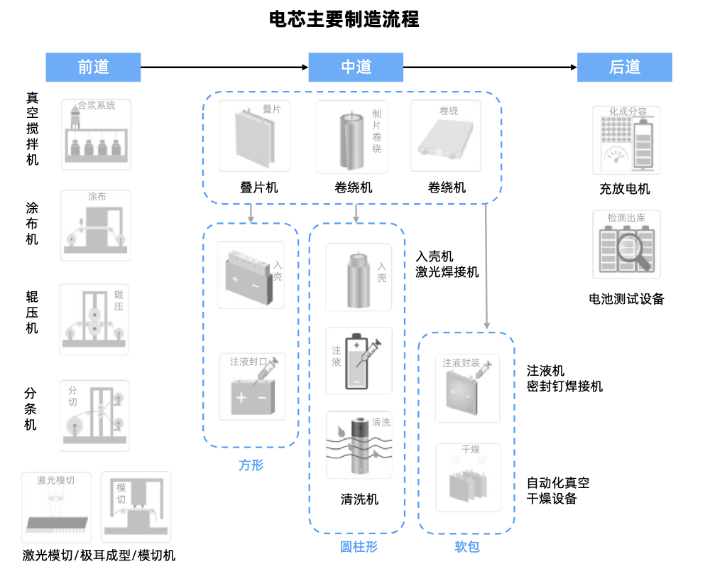 中段:电芯组装。固态电池不易使用卷绕设备,叠片设备需适应固态电解质的脆性特性,且精度和稳定性要求更高。层压需要等静压机,用于改善界面接触。