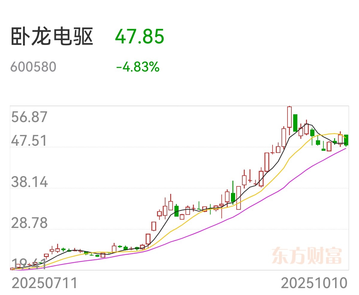 三、卧龙电驱,人形机器人龙头。当下日线回调中,股价在日线10日均线下,为弱势。10均线在调头向下,更弱。