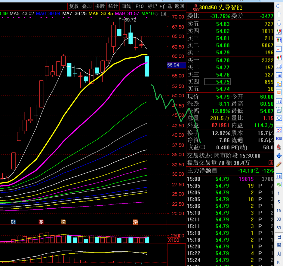 先导智能下周一估计低开百分之六以上,收盘跌百分之十以上,最近一个月一直在构筑大顶