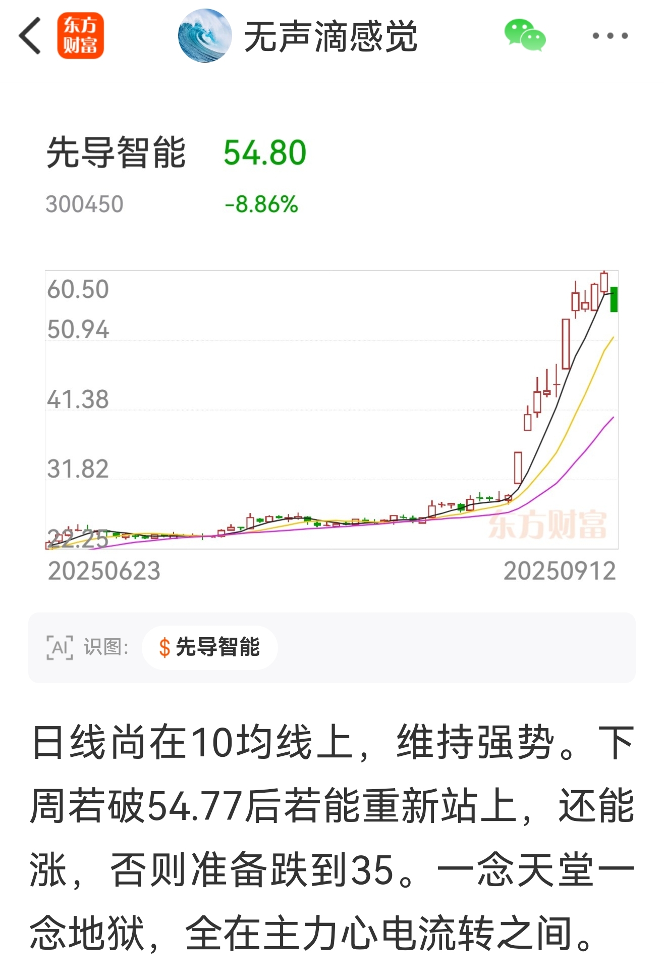日线尚在10均线上,维持强势。下周若破54.77后若能重新站上,还能涨,否则准备跌到35。一念天堂一念地狱,全在主力心电流转之间。