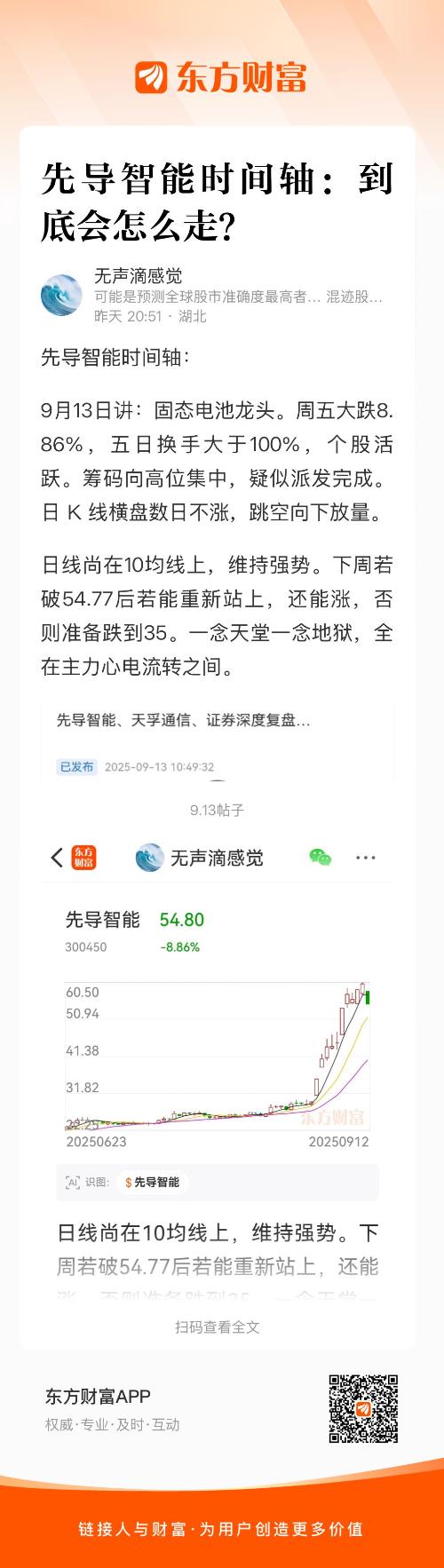 9月13日讲:固态电池龙头。周五大跌8.86%,五日换手大于100%,个股活跃。筹码向高位集中,疑似派发完成。日 K 线横盘数日不涨,跳空向下放量。