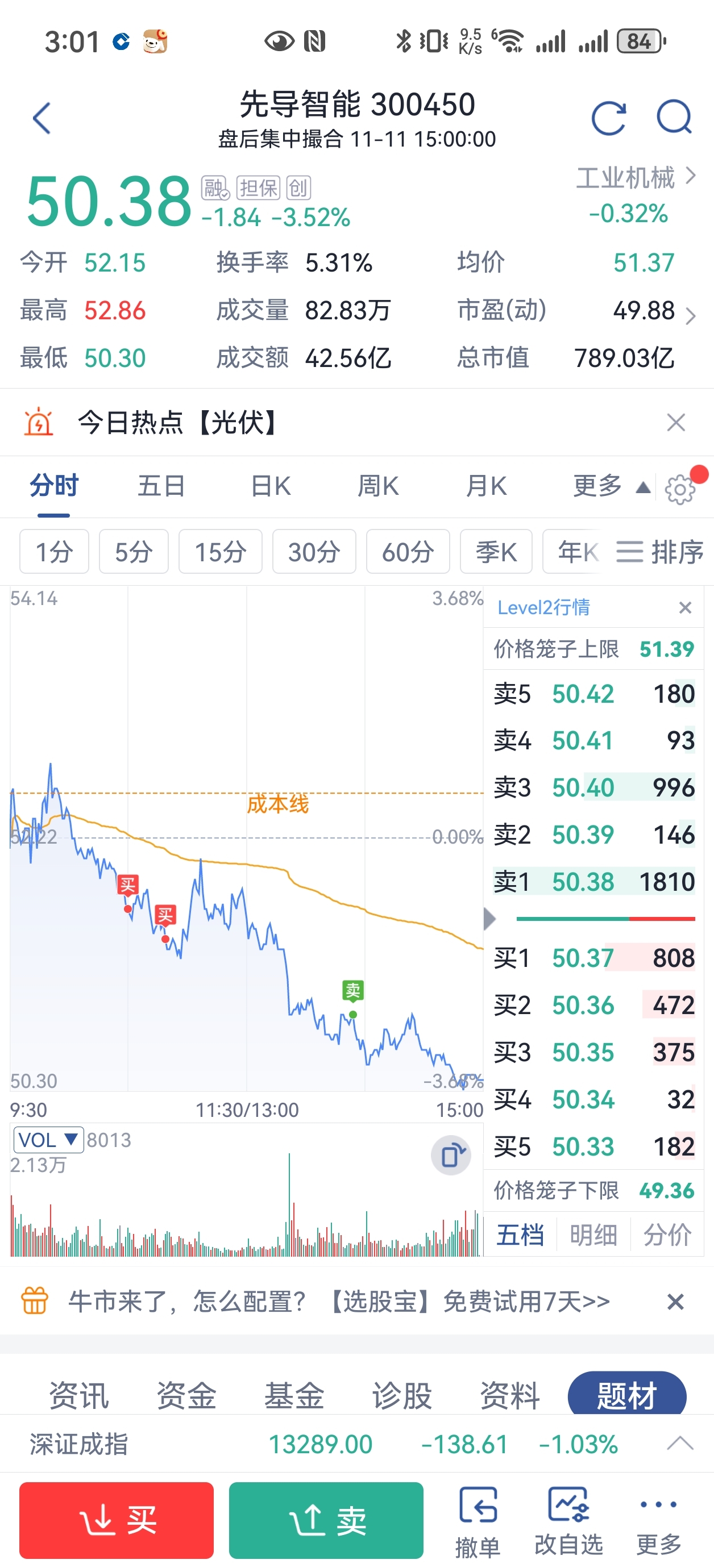 明天割肉!今天做反T了,中午之前小幅拉升一下,挂单52.10,最高52.08,稍微差点运气,认栽。