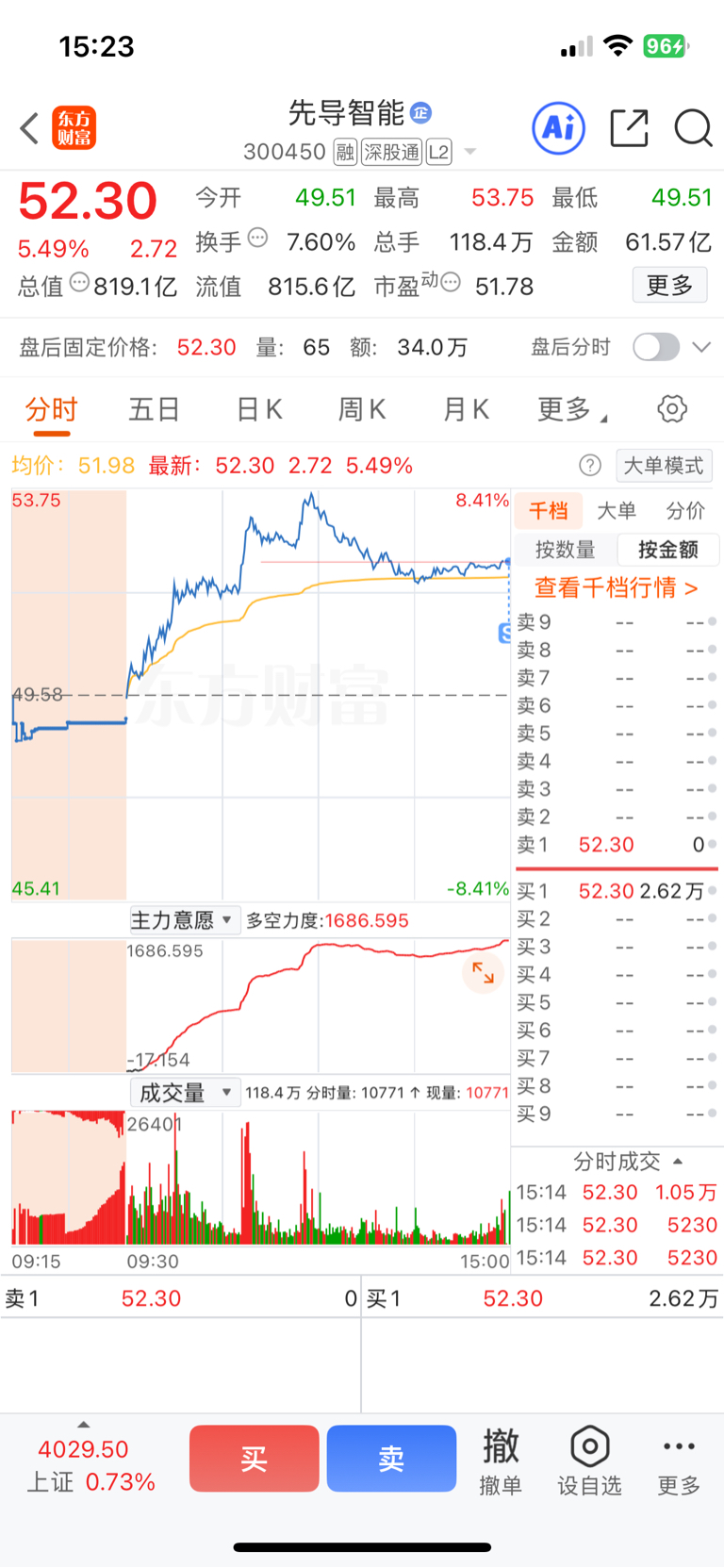 $先导智能(SZ300450)$ 50.98进的,今天跑了,今天涨幅没有达到预期