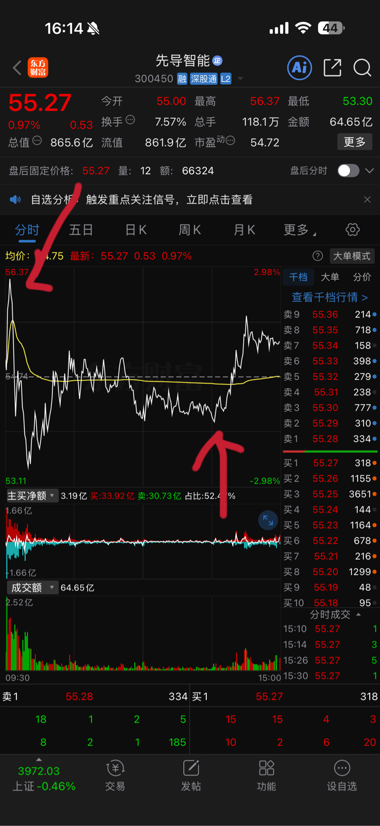 $先导智能(SZ300450)$ 早盘猛烈拉升近三个点到9.34分,然后一路砸盘到水下二个多点,一直非常弱的走势,二点后开始再次拉升,这三个小时短线资金包括前几天的获利盘包括前面的套牢盘应该跑掉很多,看上去又要全天水下尾盘深绿的节奏,这样的走势非常健康,不断让不坚定筹码出局。