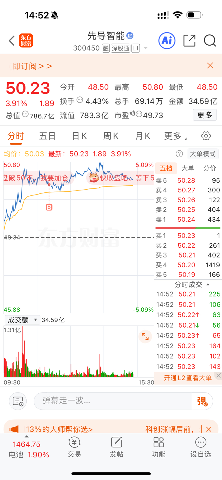 $先导智能(SZ300450)$ 50.06买入,短线来个10%