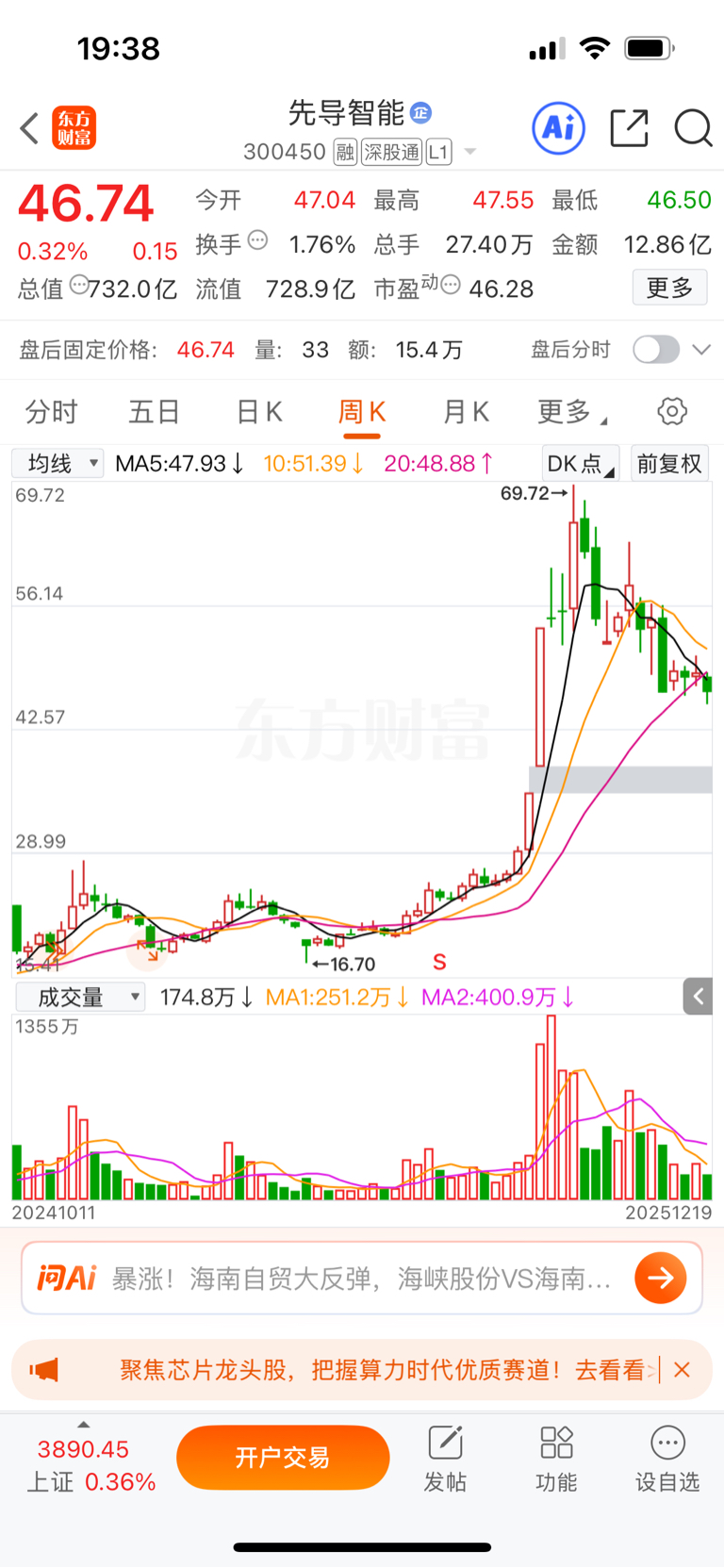 3. 先导的 20周线会上行至49.9左右。