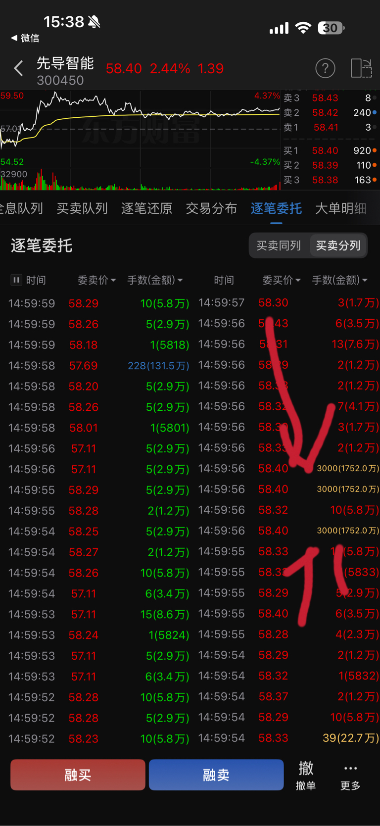 $先导智能(SZ300450)$ 尾盘集合为何会最后往上拉0.11元?就是最后几秒钟有三个三千手大单共九千手,五千多万挂收盘价买,一下子就拉上去了,如果盘中买,这么多单子可能买入平均成本会高的多,所以很多大资金往往会在集合竞价交易