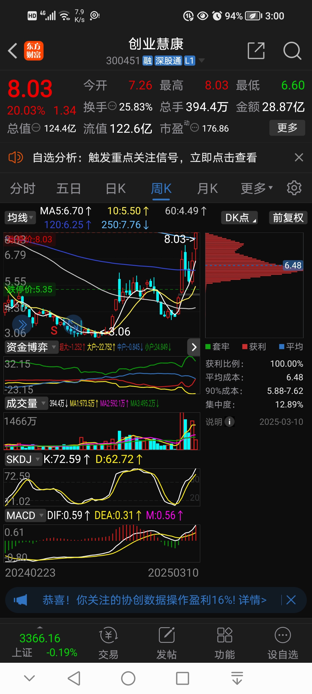 $创业慧康(SZ300451)$ 这一轮翻倍,主要创业板单日涨幅就可以20%