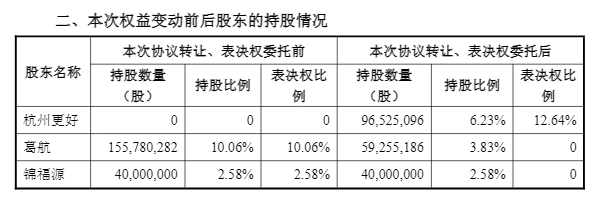 同日,双方进一步约定,葛航将其持有的公司股份(约占公司总股本的10.06%,包含拟协议转让的股份)所对应的全部表决权委托给杭州更好行使。